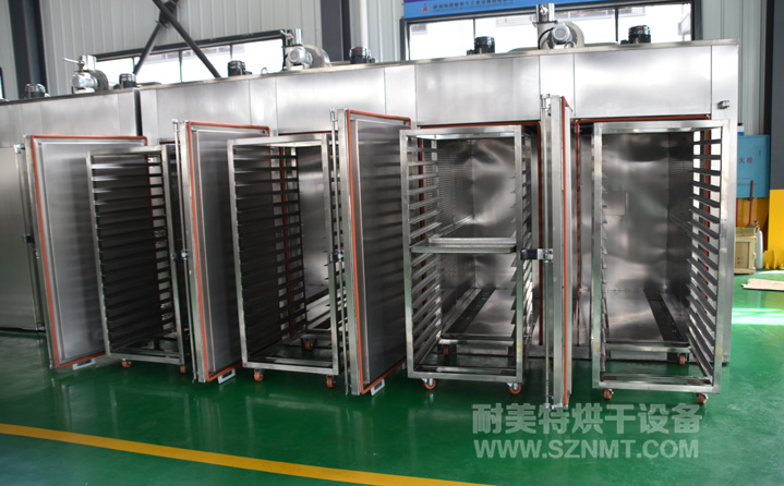 1、烘烤產品:烘箱內放置8臺尺寸為W720*940*1675的推車(推車尺寸與供方原有的同尺寸),每臺推車上32件托盤;